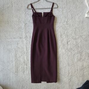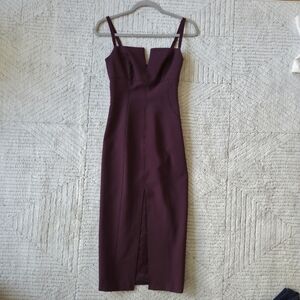 This elegant purple dress is perfect for any occasion. Its sleek design and rich color make it a standout piece in any wardrobe. It is a versatile midi dress known for its flattering sheath/bodycon fit, front slit, and quality fabric (often a stretch blend or silk), in elegant maroon/plum color. Perfect for dressing up or down.
