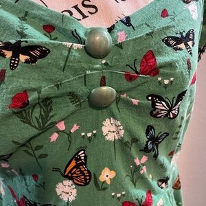Lightweight green dress with an allover butterfly and floral print.