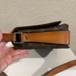 Louis Vuitton monogram canvas crossbody bag. Vachetta leather strap and trim in tan. Secure front flap with leather tab closure. Versatile compact silhouette for daily use.