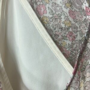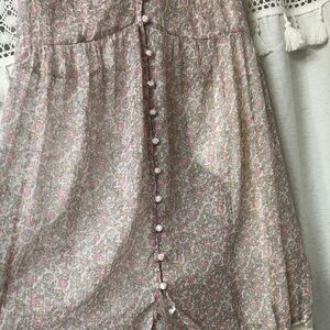 Lightweight sleeveless mini dress in a soft pink floral print. Features a button-front design and a flattering V-neck. Feminine and breezy for warm-weather wear. Pink tones add a romantic touch.