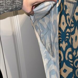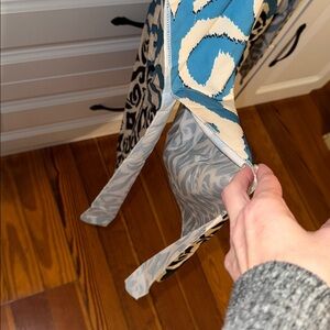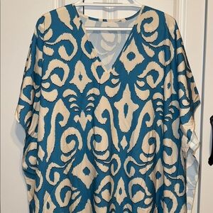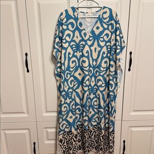 Kaftan blue and cream patterned V-neck maxi dress. Lightweight, flowy design for comfortable all-day wear. Versatile style that transitions easily from casual to dressy. Features bold blue and cream print with contrasting hem detail.