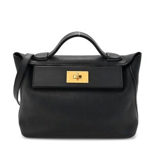 This is an authentic HERMES Togo Swift 24/24 29 in Black. This handbag is crafted of richly textured calfskin leather in black. The bag features a reinforced leather top handle, an optional leather shoulder strap and gold hardware. The flap opens to a goatskin leather interior with a zipper pocket.