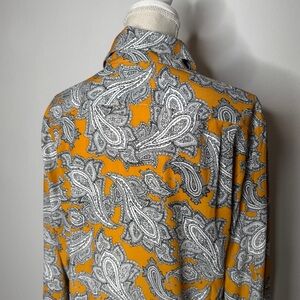 ✨ Rich mustard tones, intricate paisley detailing, and a luxe silk‑blend fabric make this Robert Graham blouse a standout statement piece.