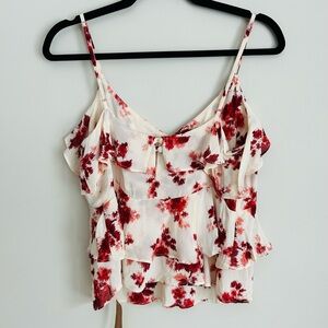 Romantic Reformation floral ruffle cami top featuring a soft cream background with red floral print. Designed with a flattering V-neckline, delicate spaghetti straps, and feminine ruffle detailing that creates a flowy, effortless silhouette.