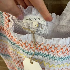 Lightweight smocked crop top with puff sleeves and square neckline. Features pastel striped stitching in peach, blue, yellow and mint on a white base. Feminine ruffle hem and elasticized sleeves for a comfortable fit. Perfect for casual warm-weather looks.
