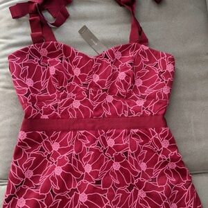 Chic floral design with a flattering silhouette. Ideal for any event. Sleeveless style for a modern look. Cute ties at the shoulders. Fully lined, perfect wedding guest dress.