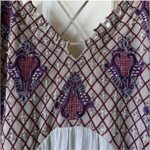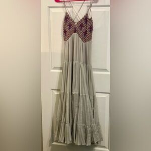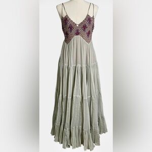 RARE & Absolutely stunning Free People “Lost in a Dream” Maxi Dress, a rare and highly detailed bohemian piece featuring a beautifully hand-beaded and embroidered bodice with intricate latticework and purple embroidery.