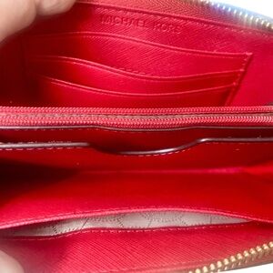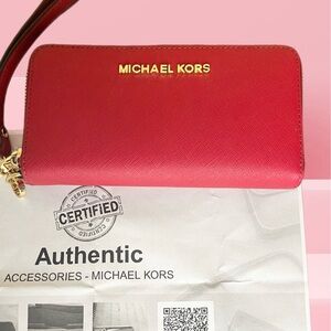 Elegant red wristlet by Michael Kors. Gold logo accent. Perfect for essentials.