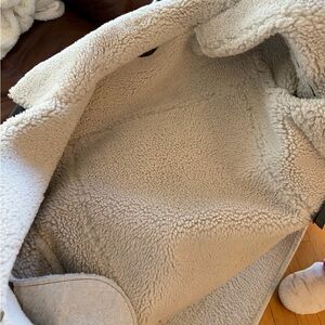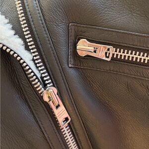 Classic AllSaints biker silhouette in black leather. Cream shearling trim at collar, cuffs, and hem. Asymmetric zip and angled zip pockets. Buckle straps at cuffs and hem for a tailored fit.