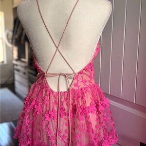 Eye-catching hot pink lace maxi with tiered layers. Spaghetti straps and a sweetheart neckline. Flirty, feminine silhouette ideal for events and nights out.