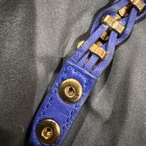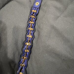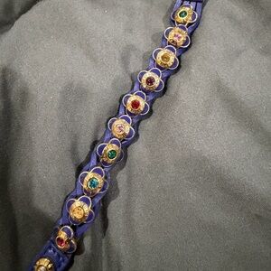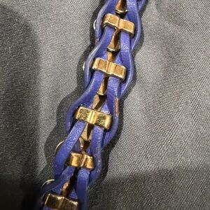 Braided blue band with gold-tone flower links. Each flower features a colored crystal accent in pink, green, red and purple. Bright and playful bracelet. Easy to style. leather bracelet hard to find . Definitely a compliment to your closet
