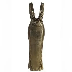 Stunning gold metallic gown with a draped neckline. Perfect for formal events. NWT, size small.