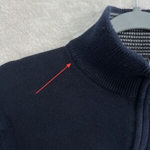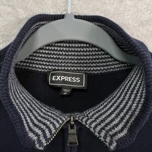 Keywords: express mens sweater, quarter zip pullover, navy quarter zip, cotton knit sweater, mock neck sweater, casual work sweater, minimalist logo sweater, lightweight knit, layering staple, mens medium sweater, fall winter layering, preppy menswear, office casual