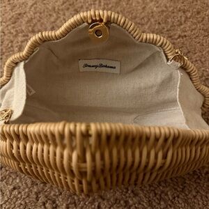 Tommy Bahama mini handbag in a shell silhouette. Woven straw body with scalloped shell form. Decorative gold-tone shell-link handle. Compact and stylish for casual outings.