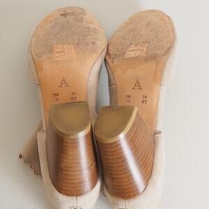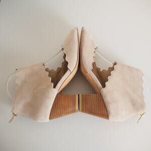 Anthropologie Block Heel Peep Toe Scalloped Shoes Women's Size 8M Tan Suede