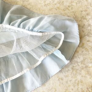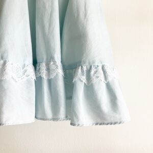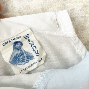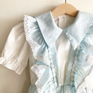 Vintage Wendy Creations of California light blue and white, puff, short sleeve, faux jumper, knee length, party dress with pointy collar, ruffle detail, lace trim and back button closure. Sleeve elastic is stretched out, waist elastic still has stretch.