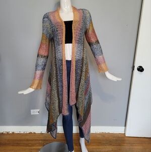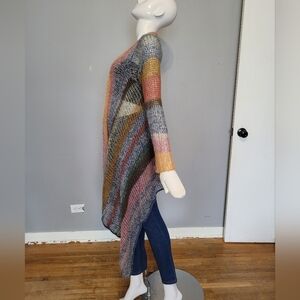 Anthropologie Knitted & Knotted Loose Knit Striped Cardigan, VGUC, Size S. No flaws to note and in excellent shape. Measures approximately 19.5" pit to pit Striped, loose knit open front cardigan with longer front/sides. It's kind of hard to see in the photos but there is a lurex thread detail to give it a bit of sparkle. Pet friendly, nonsmoking home Any questions please ask