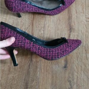Elegant pointed-toe flats in pink berry tweed. Small black bow and trim at the vamp. Gold-tone cushioned insole adds comfort. Perfect for polished everyday wear.