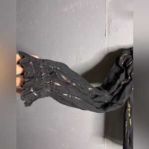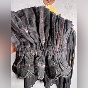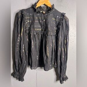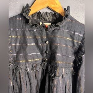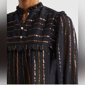Metallic Stripped Ruffle Shirt Black- Metallic stripes and ruffle trim add just the right amount of party-ready flair to this lightweight woven shirt.