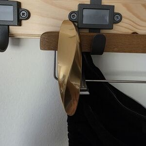 This stunning black dress features elegant gold accents, perfect for any special occasion. Its sleek design offers a sophisticated look.