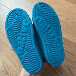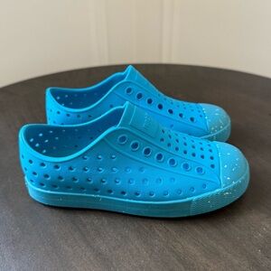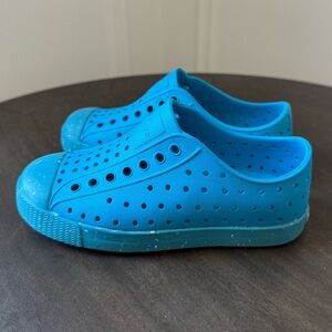 EUC Lightweight, waterproof, and easy to clean — these Native Jefferson shoes in bold blue are perfect for all your kid’s adventures! • Size: Child C11 • Color: Bright Blue with speckled toe • Brand: Native Shoes • Style: Jefferson Slip-On • Features: – Odor-resistant, waterproof EVA material – Breathable perforated design – Slip-on with secure fit – Great for summer, beach, park, or school