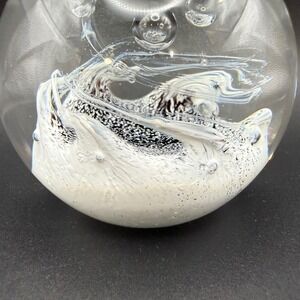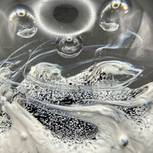 Handcrafted art glass paperweight showcases a stunning internal landscape of swirling white and black textures topped with three distinct controlled bubbles. This limited edition sphere features a complex, snowy or wave-like design that creates a sense of depth and movement within the solid clear glass. The base is etched with the series name and a specific production number, marking it as a collectible piece of studio glass. Its substantial weight and polished finish make it an elegant addition to any desk or display shelf.