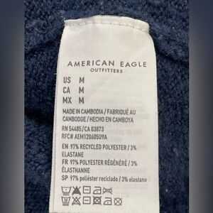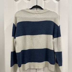 Stay cozy and stylish with this striped blue and white sweater. Perfect for any casual outing.