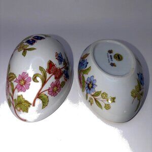 Beautiful vintage porcelain egg-shaped trinket box by MANN Korea, featuring the charming Country Butterfly floral pattern. This piece showcases delicate pastel flowers and butterflies on a glossy white background. Perfect for jewelry, keepsakes, or decorative display.