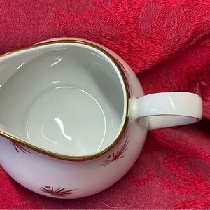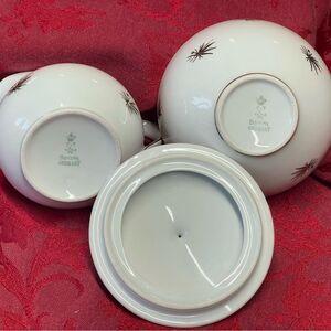 This MCM porcelain Creamer and Sugar Bowl set is so cool! Made in Bavaria, Germany between 1918-1935 by Oscar Schaller & Co. Hand painted Starbursts in 22k gold all throughout both pieces. Gold is used on the trim of them as well.