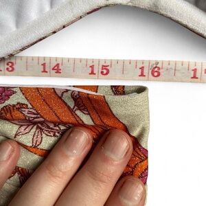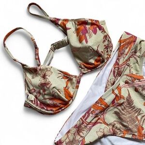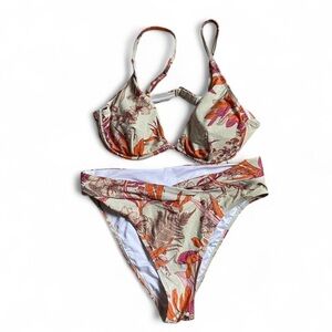 Cupshe women’s two piece bikini set in size L. This stylish swimsuit features a soft tropical floral print in warm shades of orange, pink, and beige on a light background. The top has lightly padded, structured cups with adjustable shoulder straps and a secure back clasp for a supportive and comfortable fit. The matching bottoms offer a flattering mid rise cut with moderate coverage.