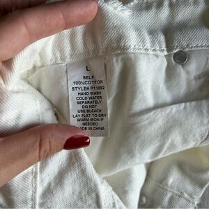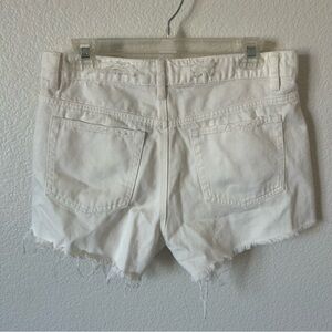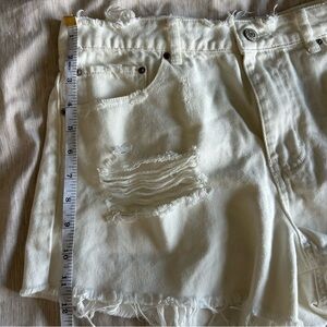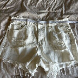 Stylish high waisted white denim shorts with a distressed design, ideal for a trendy look, grunge look or coastal cowgirl look. Made with 100% cotton so they are lightweight and breezy.