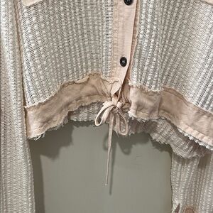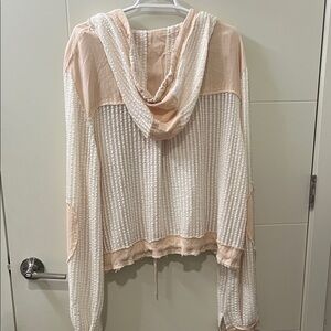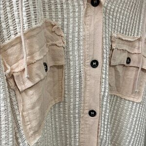 Waffle knit hooded cardigan with front button closure. Features two chest pockets and drawstring hem. Soft blush body with subtle cream trim accents. Lightweight and easy to layer.