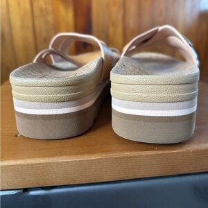 NEW without box or tags! Never been worn! Crossover leather straps for a secure fit. Cushioned cork footbed for comfort. Lightweight platform sole for subtle lift. Easy slip-on style for everyday wear.