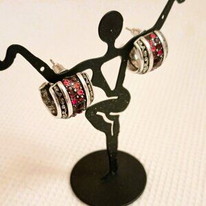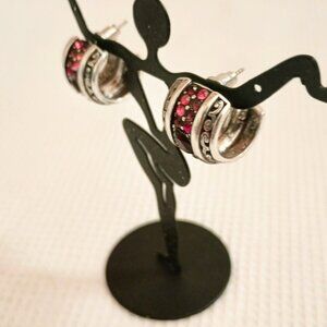 Wide Red Crystal Hoop Earrings Women's Silver Tone Scroll Post Jewelry