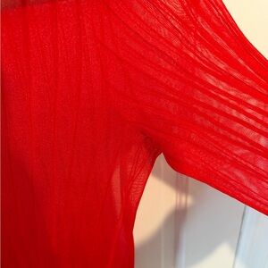 Transparent material (cotton and rayon). In great condition. No flaws. No size tag but pit to pit is about 15 in which corresponds to a small (this also stretch a little bit). Please see measurements for an accurate fit.