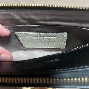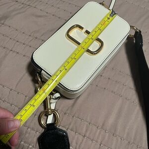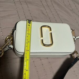 Sleek cream crossbody bag by Marc Jacobs. Features striking gold hardware. Stylish and versatile.