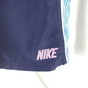 Men's Nike board shorts in navy blue with side floral graphics. Drawstring waist and 2 front pockets offer classic beach-to-street functionality for swimming, surfing, or casual summer wear.