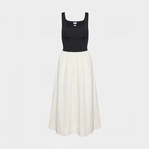 This is a squareneck midi dress with a fit-and-flare silhouette. The bodice is cut from Aritzia’s Original Contour — luxe, ultra-flattering fabric coveted for its smoothing effect and second-skin feel. Nothing more essential. The skirt is cut from 100% cotton poplin with a crisp, airy feel that’s smooth to the touch.