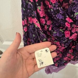Chic floral bodysuit by Free People. Features vibrant purple and pink floral pattern. Delicate lace trim adds elegance. Perfect for layering or standalone wear.