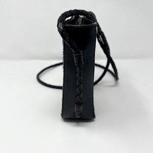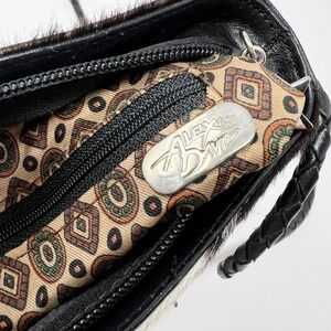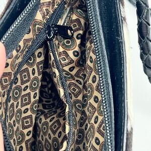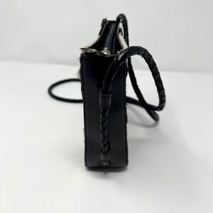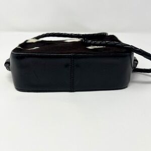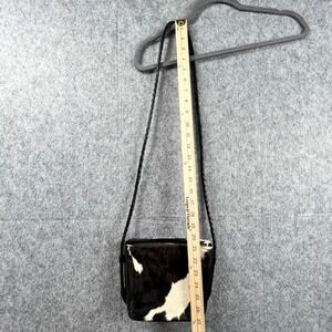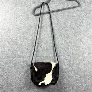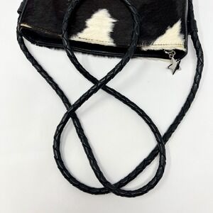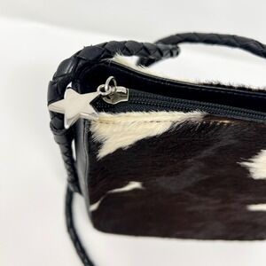 Alexis David Cowhide fur crossbody bag features a striking black and white animal print with a soft calf hair texture. The compact silhouette is accented by a unique star-shaped zipper pull and a braided leather shoulder strap for a touch of western-inspired flair. Inside, the bag is lined with a geometric patterned fabric and includes a zippered pocket for organization.