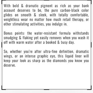 Brand new Il Makiage Black Card waterproof liquid eyeliner. Ultra-black carbon pigment with smooth, sleek application. Long-wearing, smudge-resistant formula removes easily with warm water. Perfect for sharp wings, bold definition, or graphic liner looks.