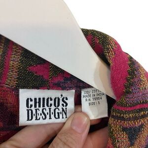 Add a statement piece to your wardrobe with this vintage Chico’s tapestry jacket. Featuring an Aztec Southwestern tribal-inspired design in rich colors, this 100% cotton jacket is perfect for layering over casual outfits or dressing up for boho-chic looks.