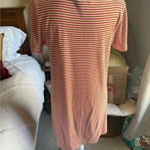 Short-sleeve tshirt dress with red and yellow stripes. Scoop neckline. Casual and comfortable style.
