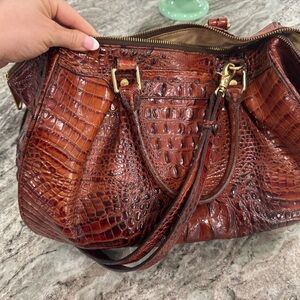 Rich chestnut croc-embossed leather shoulder bag. Features a polished gold medallion charm with Brahmin logo. Sleek silhouette with refined texture. Versatile, everyday elegance. Fair condition could be easily cleaned. Authentic leather bag with lots of life left. Open to offers. Matching wallet available as well.