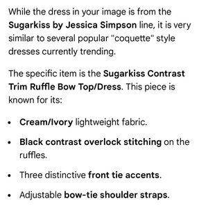 Cream lightweight dress with black ruffle trim. Features three front tie accents. Adjustable bow-tie shoulder straps. Feminine, dainty silhouette.
