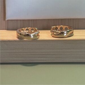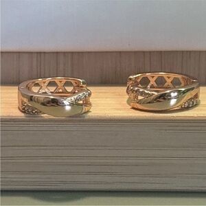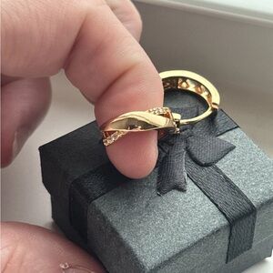 Brand new rose gold plated huggie hoop earrings featuring an elegant twisted crossover design accented with sparkling cubic zirconia stones. The sleek polished finish and modern silhouette give these hoops a sophisticated yet trendy look.