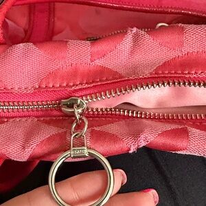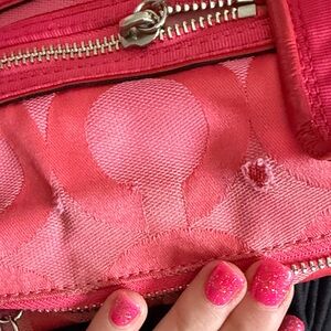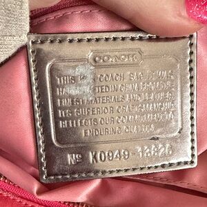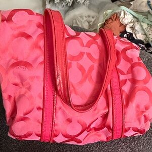 Stylish pink tote with signature Coach pattern. Features dual handles and front zip pocket. Perfect for everyday use. Two hang tags.
