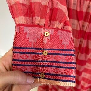 Made from semi-sheer cotton-organza, this hibiscus-red style features a bold print and is accented with playfully ruffled shoulders.
