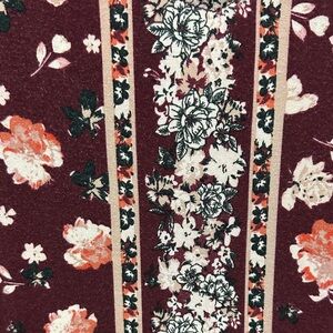 Sleeveless maxi dress with a deep V-neck. Burgundy base with all-over floral print. Center vertical patterned panel adds subtle contrast. Lightweight, breezy drape for warm days. Feminine and easy-to-style.