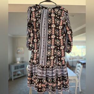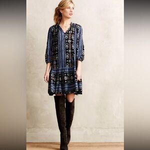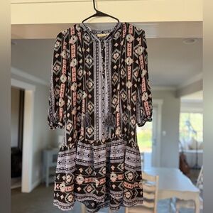 Anthropologie Holding Horses boho peasant dress in size XS. Beautiful tribal/aztec style print with subtle metallic threading throughout that catches the light. Features a relaxed flowy fit, tassel tie neckline, and 3/4 sleeves. Lightweight and perfect for festivals, concerts, or everyday boho styling.